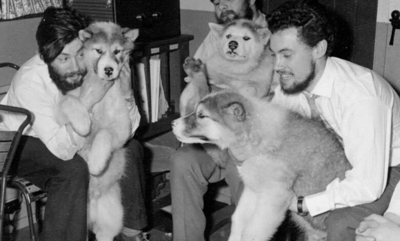 Dennis Bell (izquierda) se muestra con sus colegas y perros que los ayudaron a trabajar en la Antártida en 1959 en la Base de la Bahía de Admiralty. / Crédito: Encuesta Antártica Británica