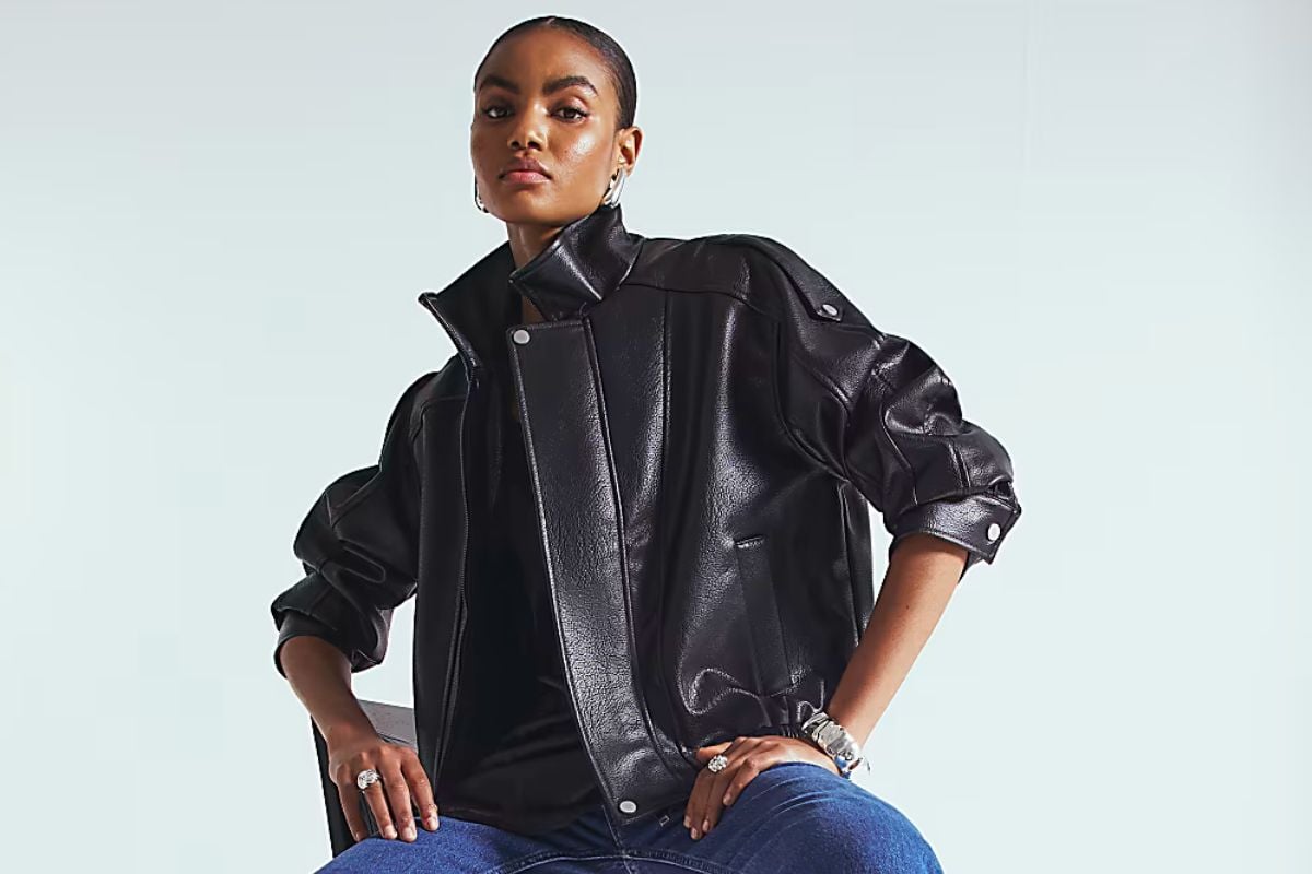 La chaqueta motociclista de cuero de cuero de Faux River Island es la chaqueta imprescindible para el estilo de la temporada de transición