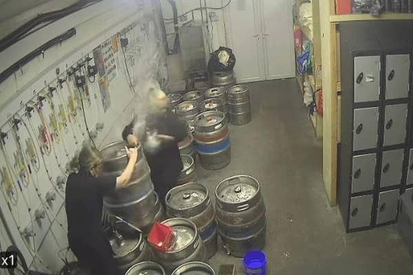 CCTV capturó el momento en que una ‘fuente de carling’ estalló de un barril explosivo, dejando a dos trabajadores de pub empapados en cerveza.