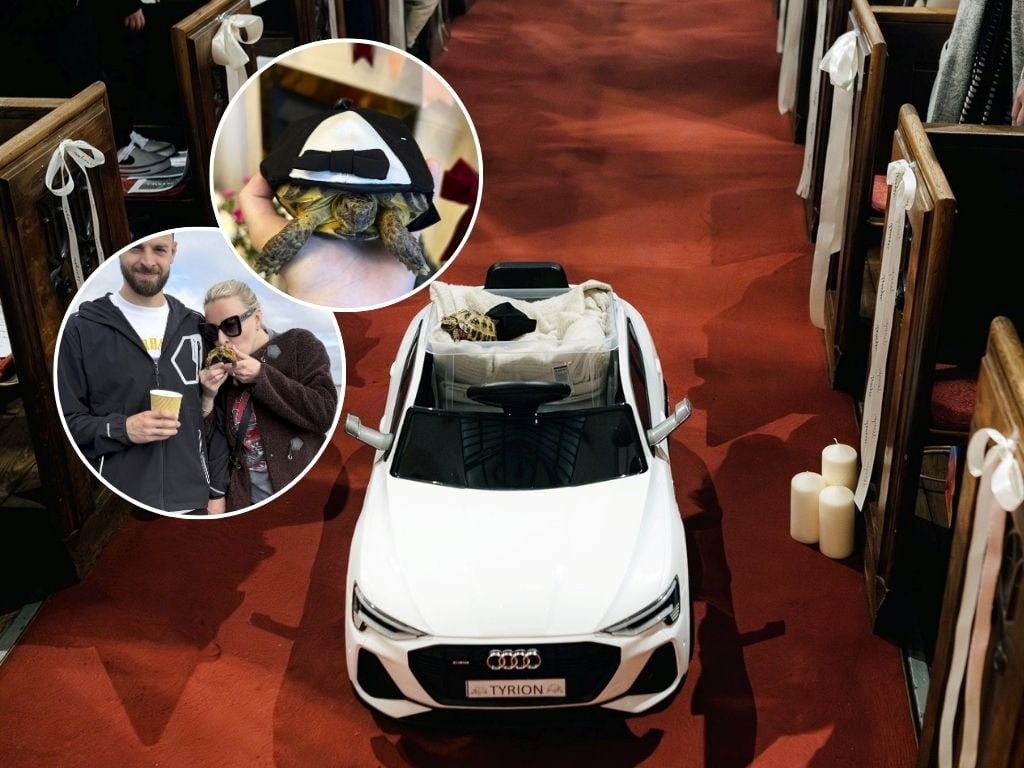 Observe el momento conmovedor cuando una tortuga mascota roba el centro de atención en la ceremonia de boda de sus dueños, cuando navega por el pasillo con un esmoquin y montando un mini -audi.