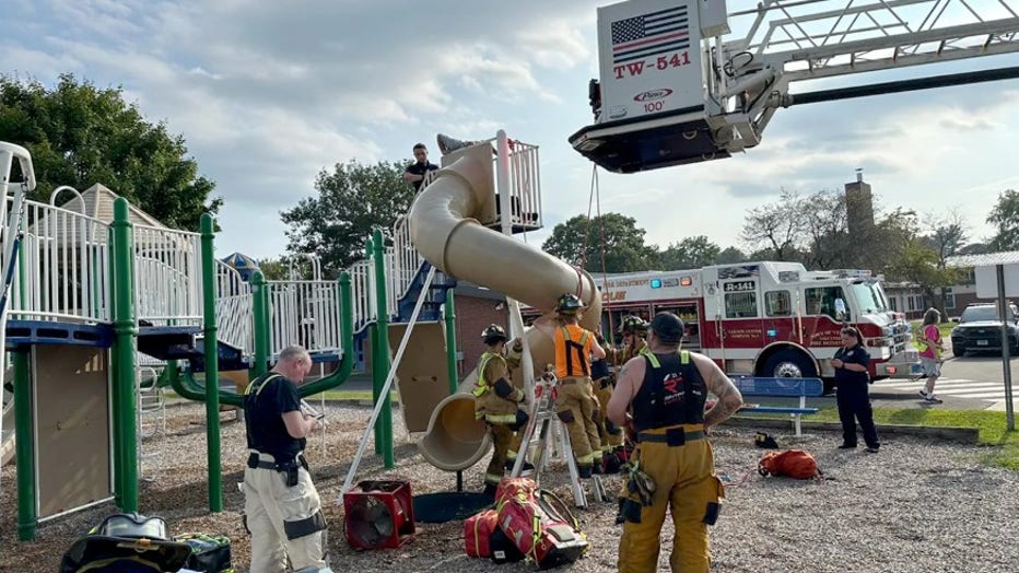 Un jugador de 40 años no identificado se atascó dentro de un tobogán de tubo en un patio de recreo de la escuela primaria en Vernon, Connecticut, el 16 de agosto.