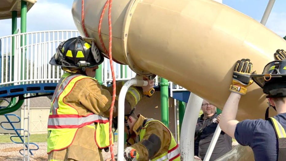 «Como Rescue 141 estaba desplegando herramientas para la extracción, la Torre 541 se estableció adyacente al patio de recreo en el césped y usó la escalera aérea como punto culminante para estabilizar la sección de portaobjetos que los bomberos estaban retirando para llegar al paciente», dijo el departamento de bomberos en Facebook.