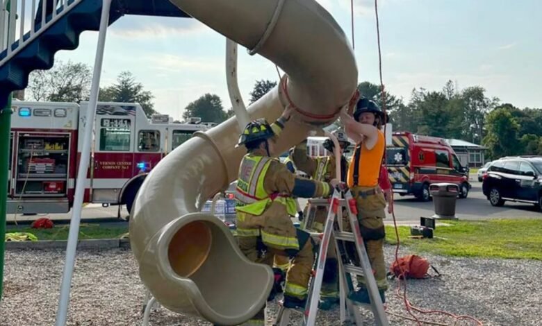 Los bomberos, EMS y policías en Vernon, Connecticut, ayudan en el rescate de un hombre atrapado en un diapositivo de juegos el 16 de agosto de 2025. (Departamento de Bomberos de la ciudad de Vernon)