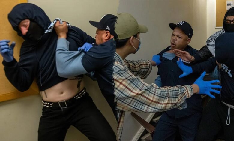 Un miembro de la tripulación de mantenimiento confronta a los manifestantes que intentan encerrarse dentro del Hamilton Hall en la Universidad de Columbia el 30 de abril de 2024 en la ciudad de Nueva York. (Alex Kent/Getty Images)