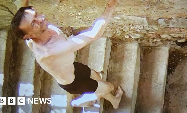 En la foto, a un hombre se ve sin camisa, descalzo y con solo pantalones cortos negros, y camina por las escaleras mientras se apoya contra una pared de piedra.