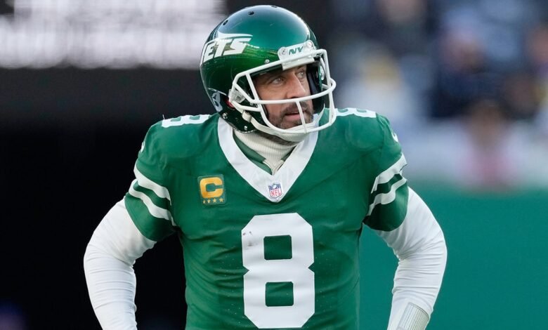 El mariscal de campo de los New York Jets, Aaron Rodgers, reacciona durante la segunda mitad de contra los Rams de Los Ángeles en East Rutherford, NJ, 22 de diciembre de 2024. (AP Photo/Seth Wenig, archivo)