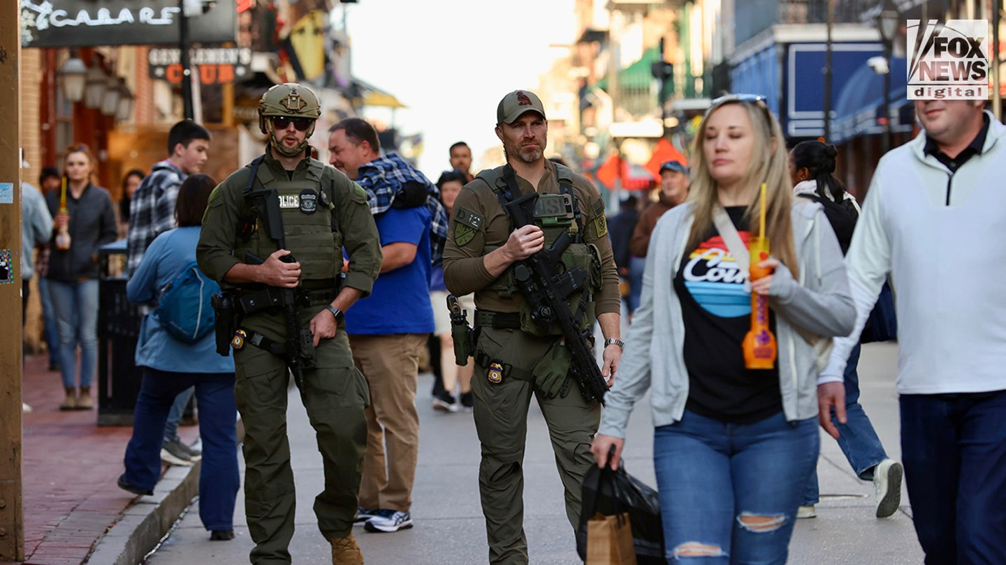 Las autoridades patrullan la calle Bourbon después de que se reabrió en Nueva Orleans el 2 de enero de 2024. Múltiples personas fueron asesinadas después de que un hombre atascó su automóvil en multitudes de juerguistas de la víspera de Año Nuevo en Bourbon Street. (Kat Ramirez para Fox News Digital)