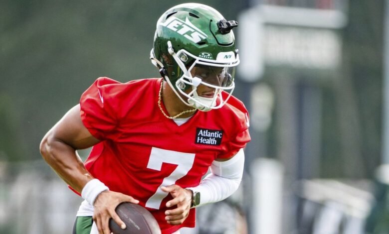 FLORHAM PARK, NJ-El mariscal de campo de los Jets de Nueva York, Justin Fields, participó en ejercicios 7 contra 7 en el campamento de entrenamiento el sábado, dos días después de ser llevado desde el campo con un dedo del pie dislocado.