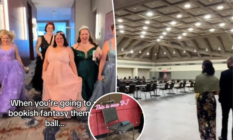 «Cuando vas a una pelota con temas de fantasía de libros», escribió en una publicación de tiktok antes de mostrar una sala de convenciones escasamente poblada sin decoraciones. «Y esto es lo que obtienes».