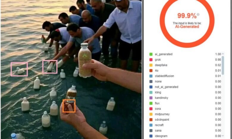 Un análisis realizado utilizando el Colmena La herramienta de verificación de imágenes en la imagen de las personas que dejaban caer las botellas en el agua concluyeron que había una probabilidad del 99.9 por ciento de que estas imágenes fueran hechas por IA.