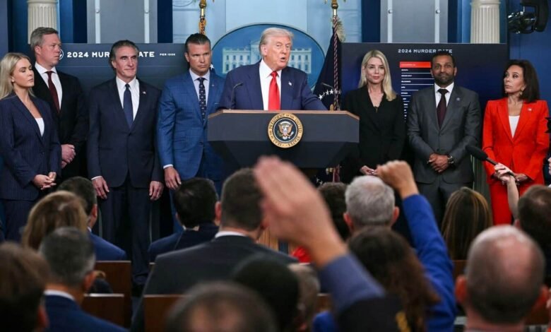 Antes de la conferencia de prensa, Trump había anunciado en las redes sociales que Washington sería «liberado hoy». Prometió terminar «días de matar despiadadamente, o lastimadas, personas inocentes». El crimen violento, incluidos los homicidios, aumentó dramáticamente en 2023, lo que convierte a Washington en una de las ciudades más mortales de la nación. Sin embargo, el crimen violento cayó un 35% en 2024, según datos federales, y otro 26% en los primeros siete meses de 2025, según la policía de la ciudad.