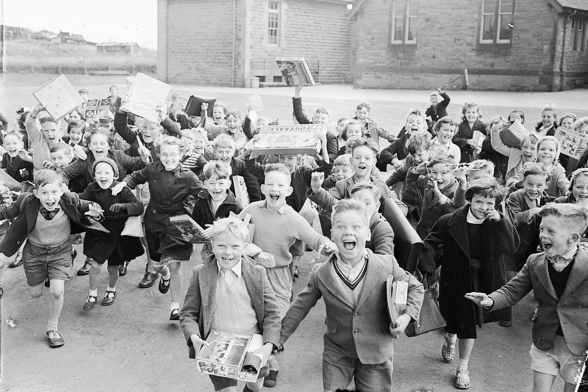 Sheer Delight está grabado en los rostros de estos jóvenes que corren a casa de la escuela para comenzar sus vacaciones de verano.