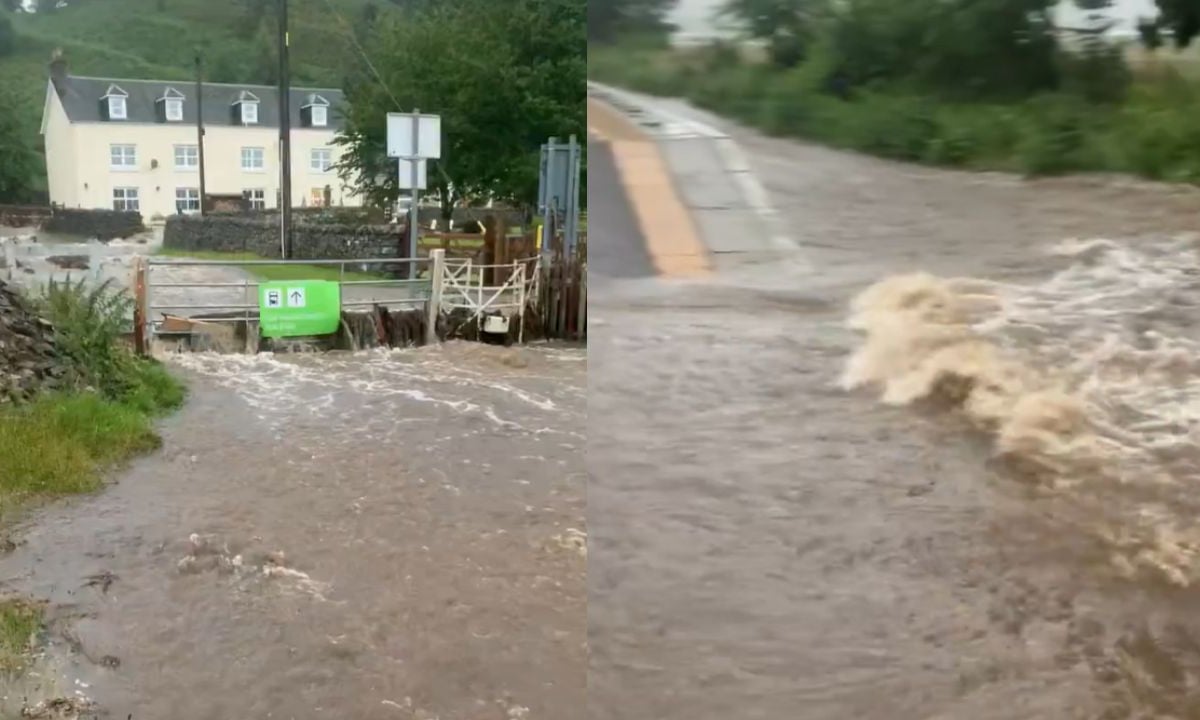 Las imágenes muestran que el agua de inundación que fluye sumergiendo una vía de tren, lo que hace que se suspendan algunos servicios de Scotrail.