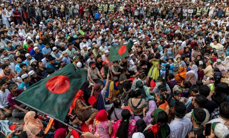 Miles de manifestantes, incluidos los partidarios de un fiesta de estudiantes recién formadaHabía estado saliendo a las calles en Dhaka durante días para exigir una prohibición de la Liga Awami.