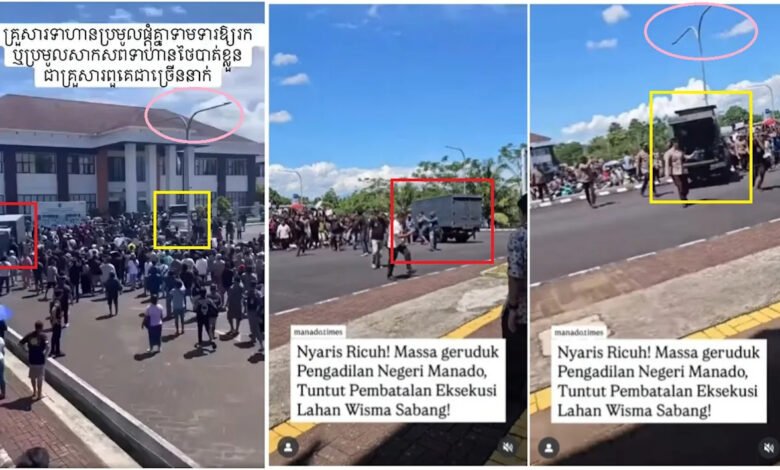 Después de un alto el fuego entre Bangkok y Phnom Penh que terminó cinco días de enfrentamientos fronterizos mortales, un video de una manifestación en Indonesia se compartió falsamente en puestos en idioma jemer alegando que mostraba a los manifestantes tailandeses exigiendo que su gobierno recuperara los cuerpos de soldados asesinados en el conflicto. El clip fue filmado fuera del Tribunal de Distrito de Manado en la provincia de Indonesia en el norte de Sulawesi, y muestra una protesta por una incautación de tierras ordenada por la corte.