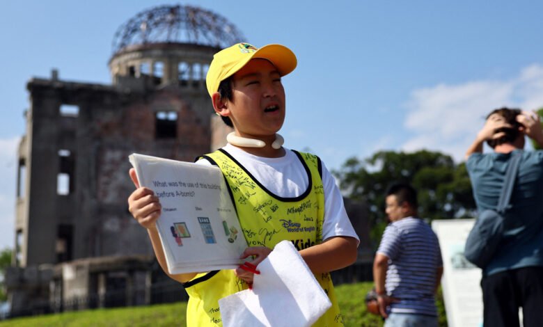 Un voluntario de 12 años se asegura de que los visitantes del Parque de la Paz de Hiroshima puedan ver personal a la tragedia del primer bombardeo nuclear del mundo, relatando las experiencias de su propia familia transmitida por la generación a la generación.
