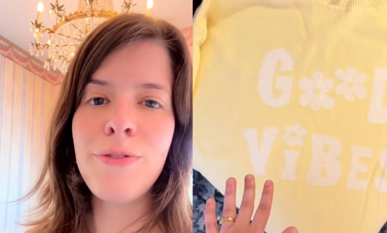 ¡Su atuendo es todo menos común! En primer lugar, está siendo enterrada en una sudadera amarilla brillante impresa con las palabras, «buenas vibraciones».