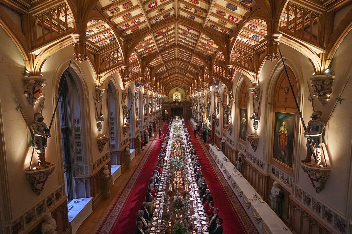 La familia real y ciento sesenta invitados se reunieron en St George’s Hall, en una mesa que tardó casi una semana en yacía, para el banquete estatal en honor al presidente francés Emmanuel Macron