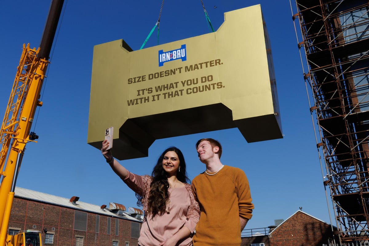 Los viajeros de la hora pico se sorprendieron al ver una enorme viga dorada suspendida junto a una de las secciones de autopistas más ocupadas de Escocia, invitando a los fanáticos a buscar la búsqueda del oro restante de 18 quilates de Irn-Bru, una pulgada de una pulgada escondida en las latas en todo el Reino Unido, por el valor de las horas de £ 10,000 cada una.
