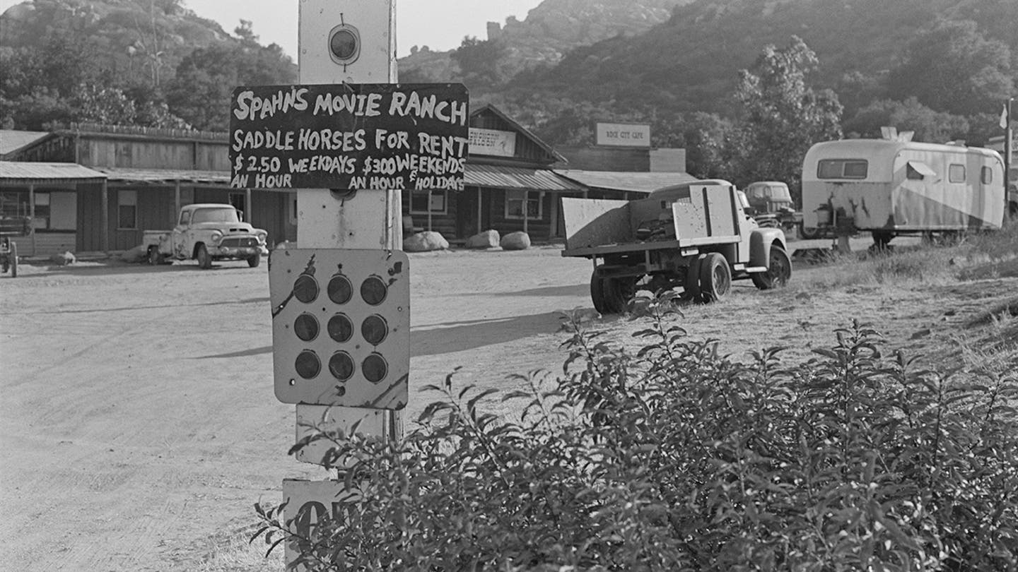 Un letrero en el Spahn Movie Ranch, propiedad del ranchero estadounidense George Spahn y la residencia de la familia Manson en el condado de Los Ángeles, el 28 de agosto de 1970. (Archivos de Michael Ochs/Getty Images)