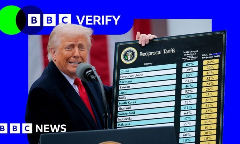 Getty Images Donald Trump sostiene una junta que muestra tasas arancelas que se nivelarán contra los países. Lleva un traje oscuro y la imagen se impone sobre los colores BBC Verify. Getty Images