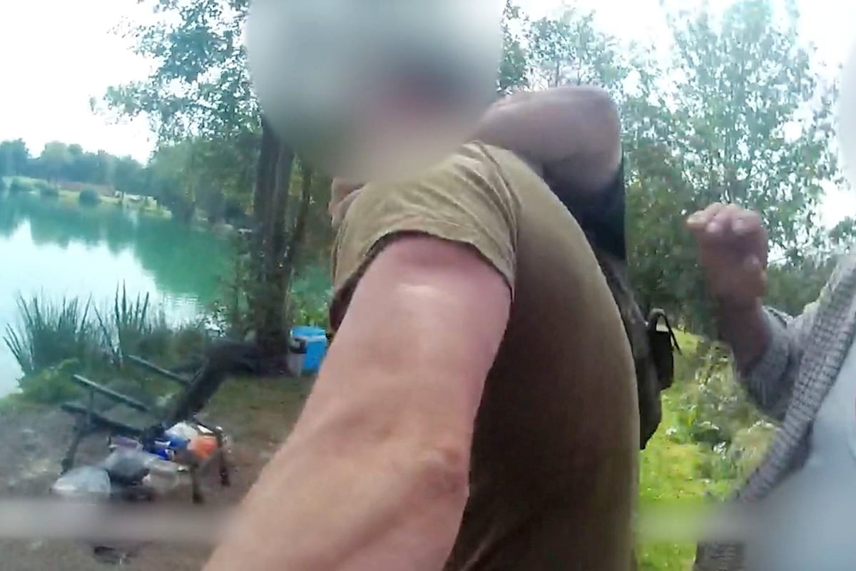 Las imágenes impactantes muestran a un padre y un hijo atacando violentamente a los alguaciles de agua después de ser atrapados sin licencia.