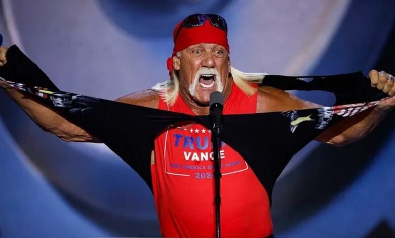 En la Convención Nacional Republicana el año pasado, Hogan respaldó al presidente Donald Trump Para otro término arrancando su camisa para exponer una camisa sin mangas «Trump Vance hace que América sea genial».