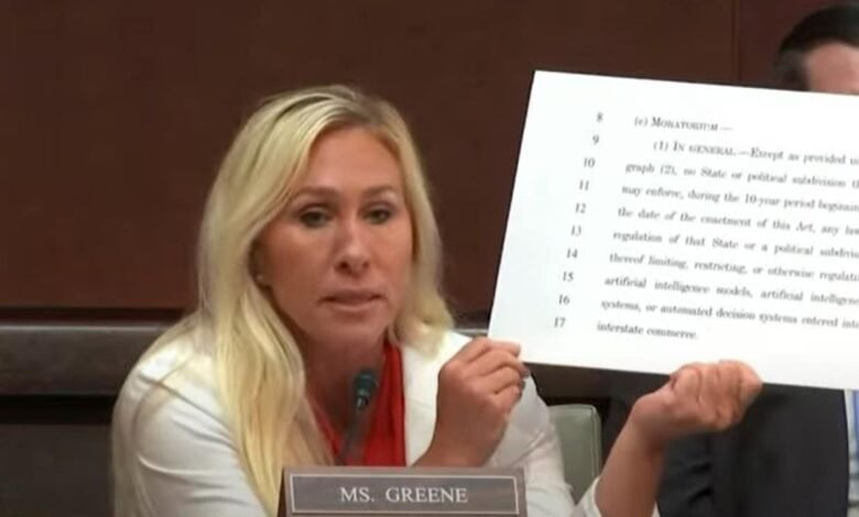 La representante Marjorie Taylor Greene (R-Ga.) Promete oponerse al paquete legislativo característico del presidente Trump, el único gran proyecto de ley (OBBB), cuando regresa a la Cámara, citando una disposición que dice que se tira estados de su derecho a regular la inteligencia artificial (AI) durante una década.