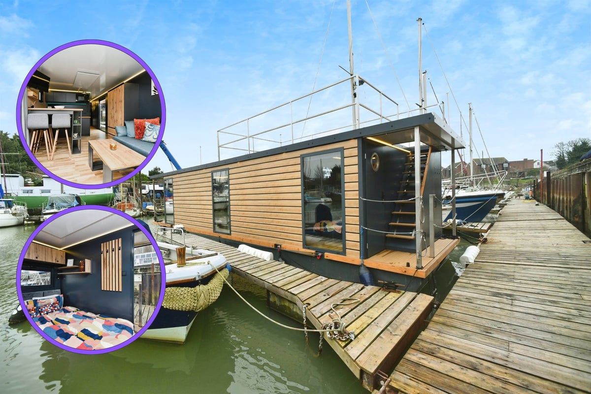 Paso a bordo de nuevas casas flotantes de lujo con terraza en la azotea, como la investigación sugiere que vivir en el agua aumenta la salud mental