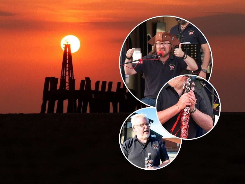 Sea Shanty Crew Boozy Seaside Sing-Along durante la impresionante puesta de sol en la estación de Rnli