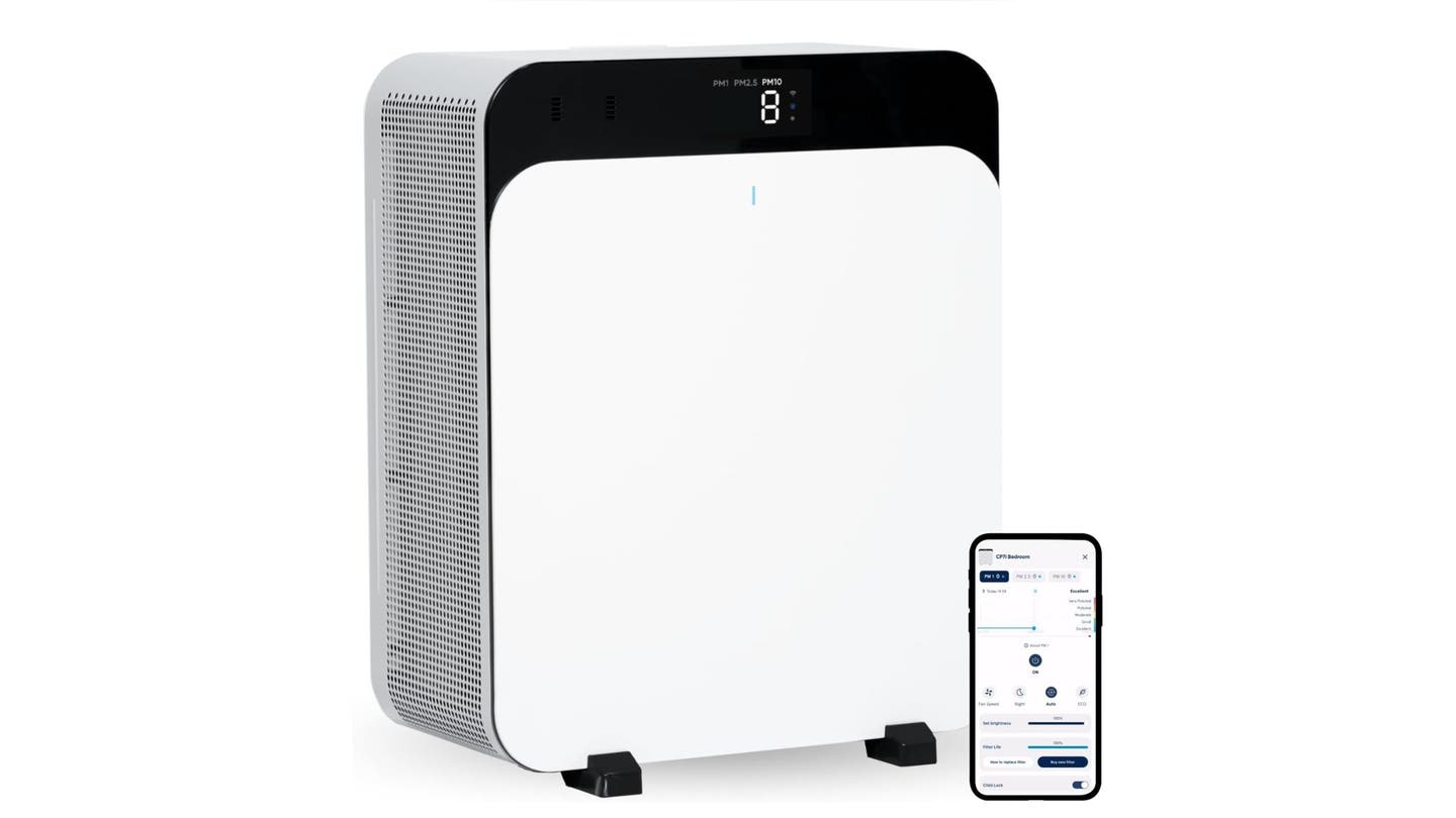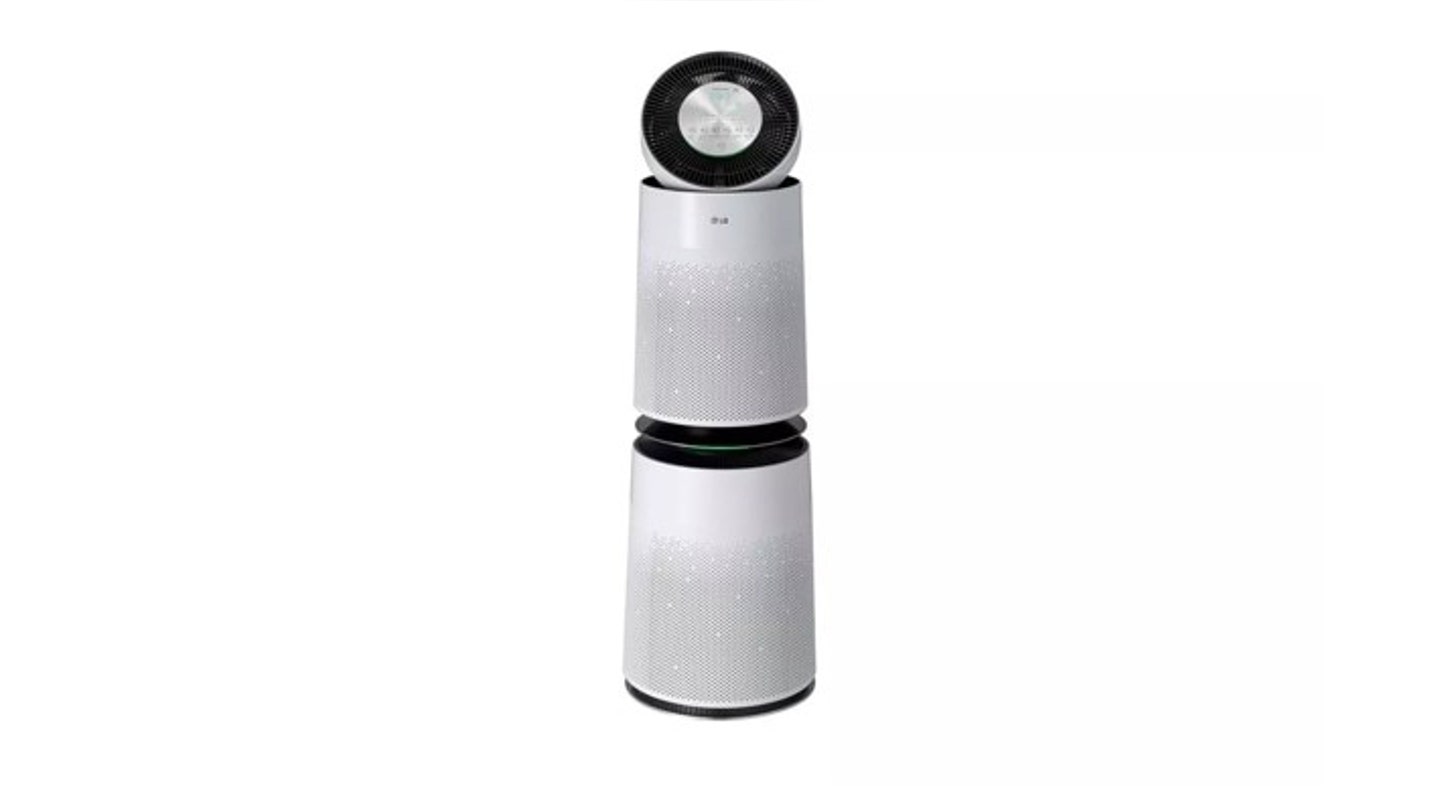 El LG Puricare es un purificador de aire de torre Eso es mejor para habitaciones de hasta 512 pies cuadrados. Dirty Air se saca de todas las direcciones y los dos ventiladores de refuerzo limpios del sistema se retiran del sistema. El purificador es un susurro, lo que lo hace ideal para salas de estar y habitaciones para niños, y se puede controlar desde cualquier lugar desde la aplicación LG Thinq.