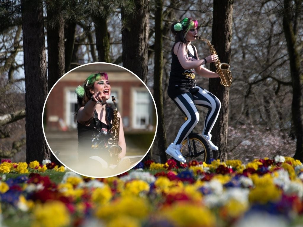 Conoce al entusiasta de los monociclo que toca el saxofón mientras viaja en una rueda, y mira mientras hace malabares con los machetes en el parque.