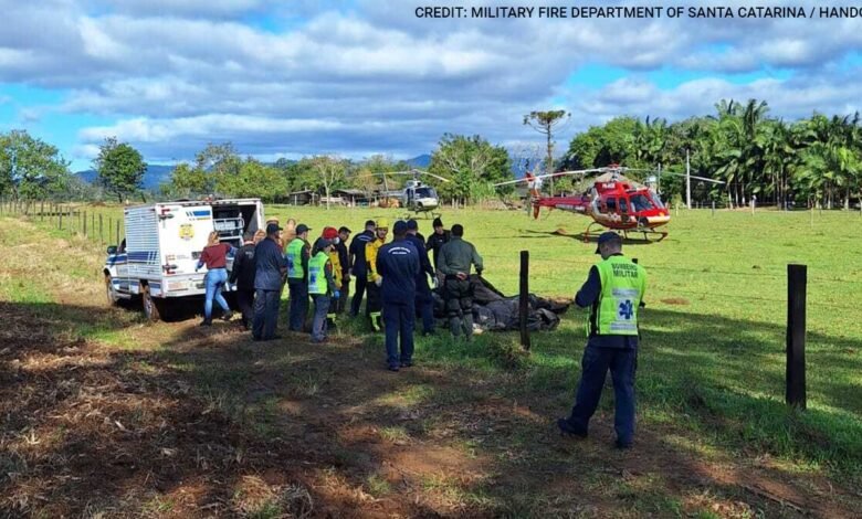 Los servicios de emergencia operan en el área donde se estrelló un globo de aire caliente, dejando al menos ocho muertos en Santa Catarina, Brasil, el sábado. (CBMSC/Brasil/Handout/Anadolu a través de Getty Images)