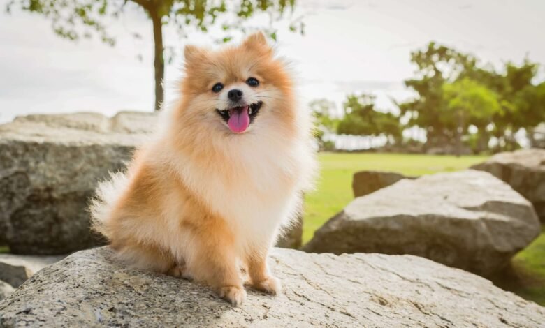 Pomeranian Spitz sonriendo Mira el sol de la noche.