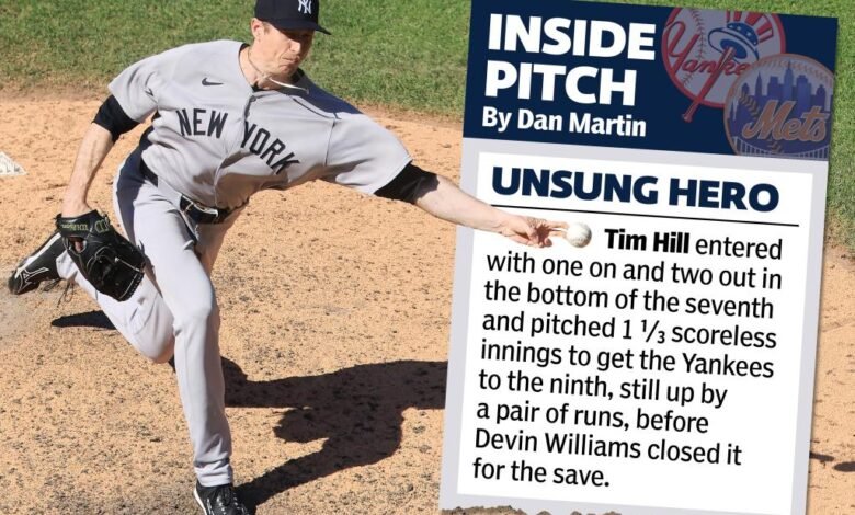 Tim Hill entró con uno y dos en la parte inferior de la séptima y lanzó 1 ⅓ entradas sin goles para llevar a los Yankees al noveno, todavía en un par de carreras, antes de que Devin Willaims lo cerrara para guardar.