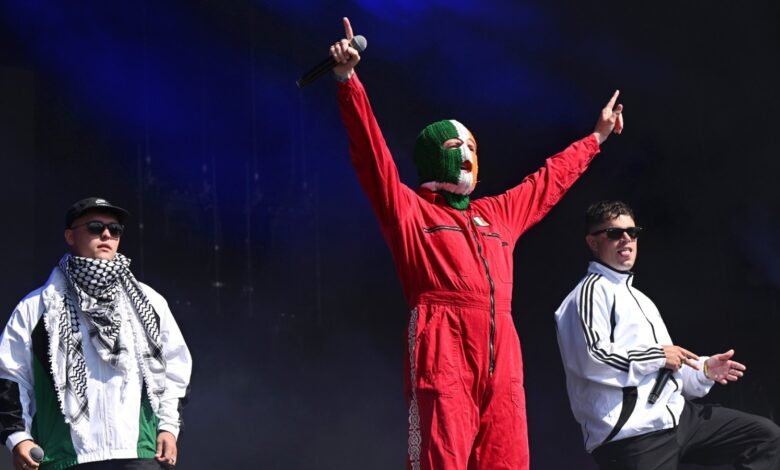 La banda de Belfast, que rapea en gaélica como una declaración política propia, ha estado en la mira este año más que nunca. En Coachella en abrilComenzaron uno de sus sets con un mensaje de pantalla que decía: «Israel está cometiendo genocidio contra el pueblo palestino», seguido de: «Está siendo habilitado por el gobierno de los Estados Unidos que arma y financian a Israel a pesar de sus crímenes de guerra». En Glastonbury el mes pasadoLa banda lideró a la multitud en un canto de «Fuck Keir Starmer».