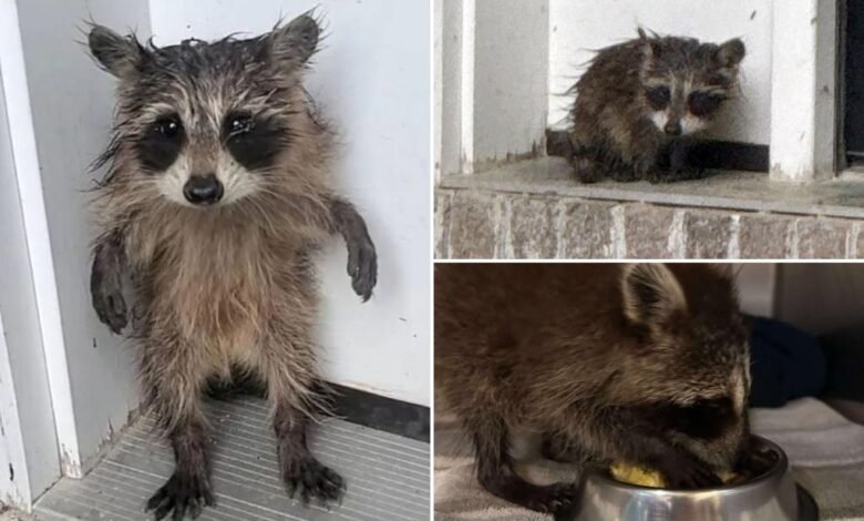 Hubo escenas adorables, pero desgarradoras, cuando se encontró un mapache de bebé asustado y mojado en la puerta de un propietario.