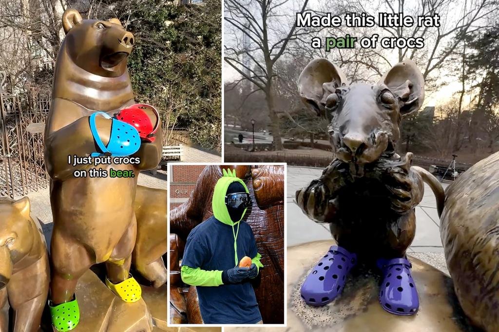 «Me tomó dos semanas hacer estos cocodrilos de pato personalizados para esta estatua de pato. No sé, pensé que sería divertido», dice en un video del 1 de marzo mientras colocaba zapatos blancos en los pies de la pizca de la estatua de «patito feo» de bronce ubicado cerca de East 74th Street en Central Park.