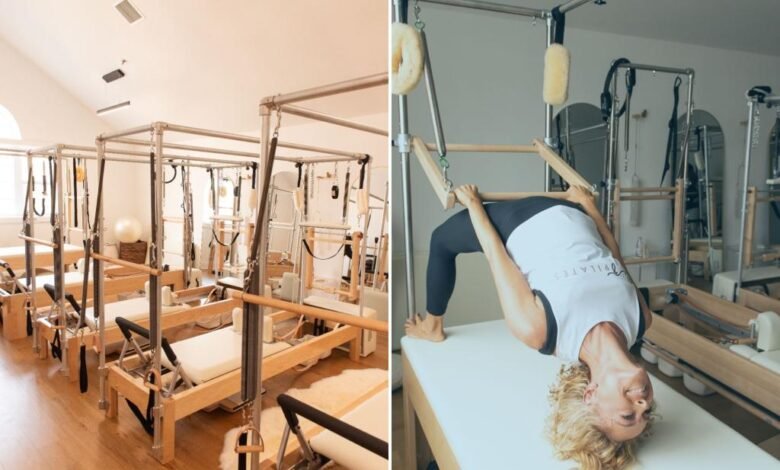 Todo el equipo está hecho a mano con marcos de madera y tapicería de Adobe White. Zeller cree que esta es la primera vez que se enseñará una clase de grupo de Pilates en Cadillacs: estructuras de cuatro postes con resortes, mangos y barras que brindan diferentes oportunidades de ejercicio. «Hay tanto que puedes hacer en un Cadillac para desarrollar fuerza», dijo. «Por lo tanto, poder incorporarlos a una experiencia de clase grupal es realmente único».