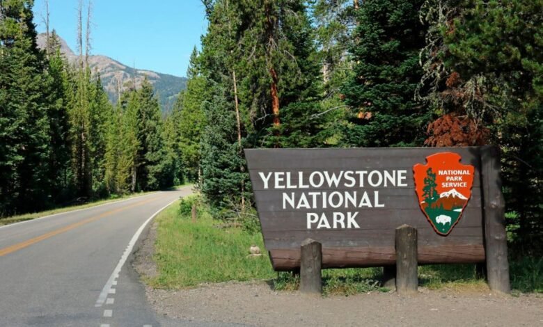 Archivo-un letrero de entrada a lo largo de la autopista estadounidense 212 en la entrada del noreste al Parque Nacional de Yellowstone en Wyoming. (Foto de Education Images/Universal Images Group a través de Getty Images)