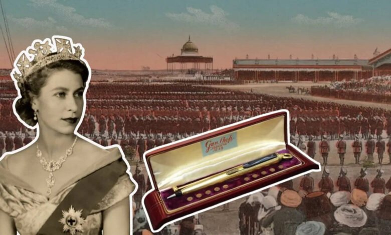 Un viaje visual a través del legado principesco de la India: la reina Isabel II con el collar Nizam of Hyderabad, la pluma de la pistola regalada por Maharaja Hanwant Singh de Jodhpur, y un atisbo de un Gran Delhi Durbar de 1911, donde los reales indios presentaron regalos lujosos a la monarquía británica en un espectáculo de leyaltad, diplomato y esplendor.