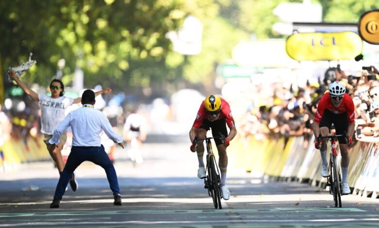 Un manifestante oponerse La participación de Israel En el Tour de Francia, fue aprehendido rápidamente después de intentar interrumpir la prestigiosa carrera ciclista.