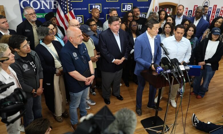 JB Pritzker, gobernador de Illinois, Izquierda, y el representante estatal Gene Wu, demócrata de Texas, durante una conferencia de prensa en la oficina del Condado de Dupage del Partido Demócrata en Carol Stream, Illinois, 3 de agosto de 2025.