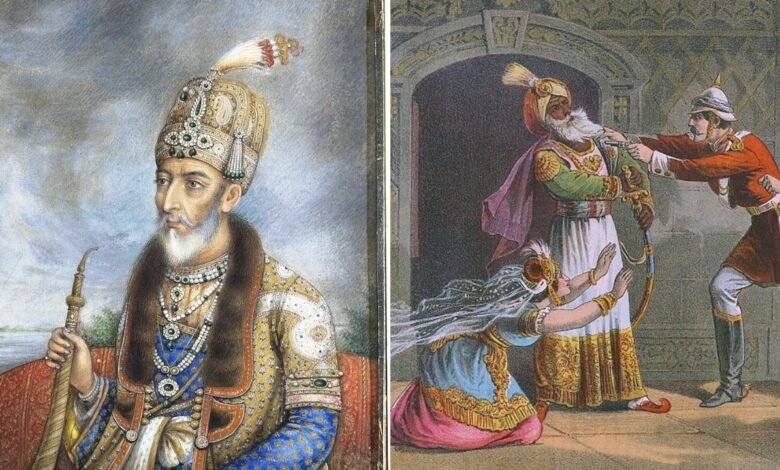 (L) Bahadur Shah II de la India, Wikimedia Commons (R) La incautación del rey de Delhi por el Capitán Henry M Hodson de Hodson’s Horse ‘, pintado por un artista británico en 1878 (Wikimedia Commons)