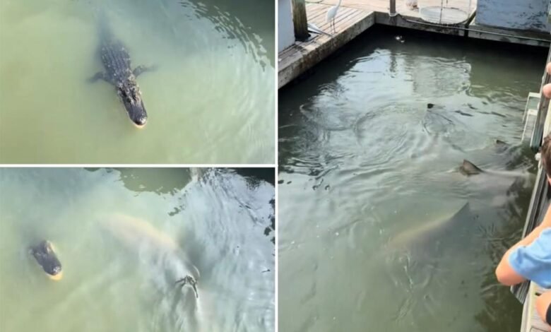La vista inusual estaba en exhibición cerca de un muelle en Hilton Head mientras los tiburones masivos nadaban sin cuidado en el mundo, mientras que un cocodrilo descansaba a un lado a la sombra, según videos capturados por vacacionistas estampados.