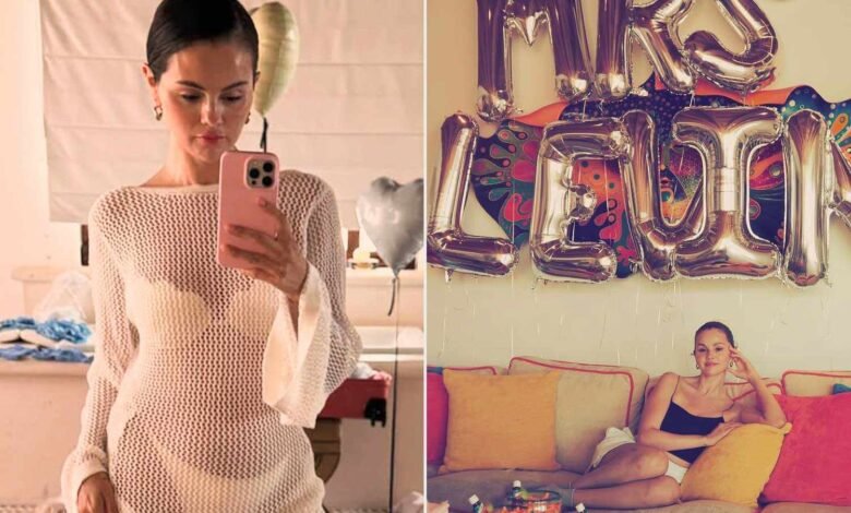 La publicación festiva de Gómez incluyó decoraciones para el fin de semana, como globos que decían «Sra. Levin» y «Bride» sobre su cama.