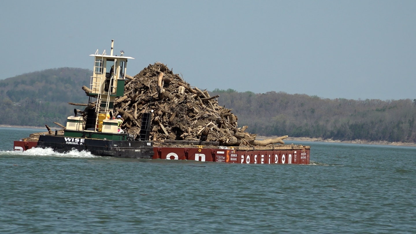 Clint Stanley es uno de los aproximadamente 100 trabajadores de TVA encargados de limpiar las 390 millas de costa del depósito. Hasta ahora, su equipo ha eliminado más de 96,000 yardas cúbicas de escombros del embalse. Eso fue suficiente para llenar 96 barcazas.