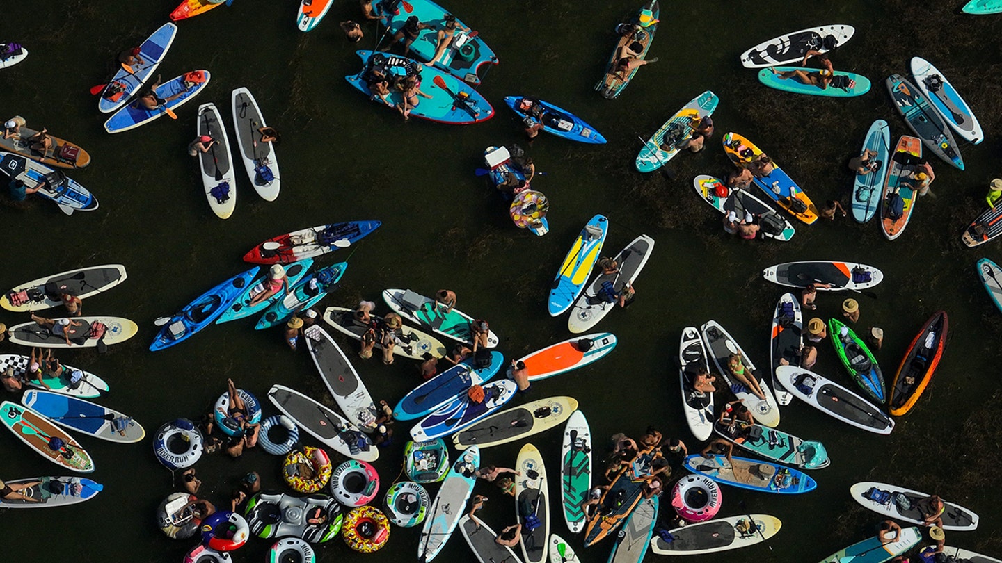 Los kayakistas y los paddleboarders se reúnen en Lady Bird Lake para celebrar el Día de los Caídos en Austin, Texas, el 27 de mayo de 2024. (Jay Janner/American-Statesman/USA Today Network)