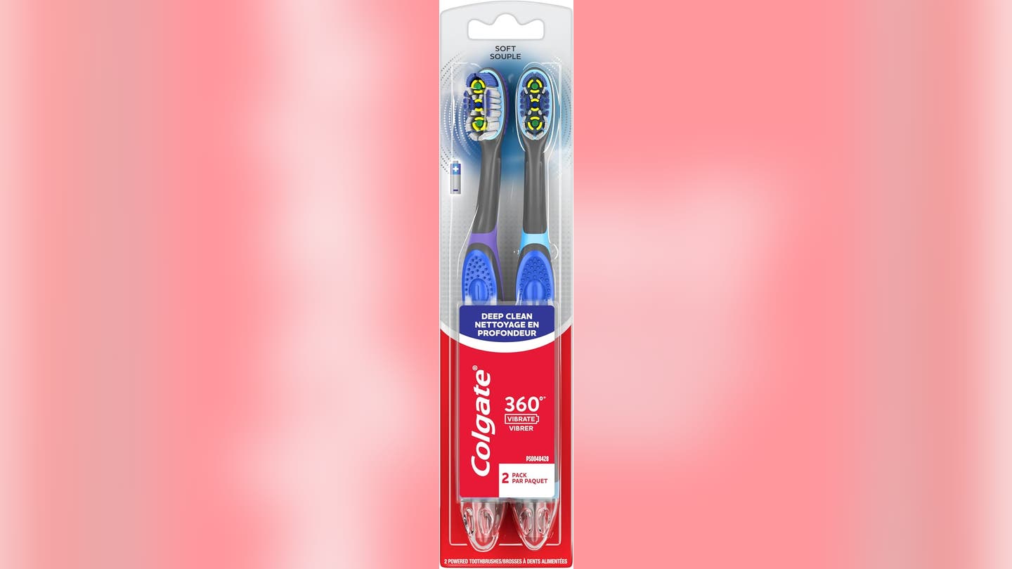 El Colgate 360 Cepillo de dientes operado con baterías Proporciona vibraciones sónicas, que contribuyen a una limpieza más profunda que el cepillado manual solo. La cabeza del cepillo presenta cerdas de punta de hilo dental que alcanzan más profundamente entre los dientes y a lo largo de la línea de las encías.