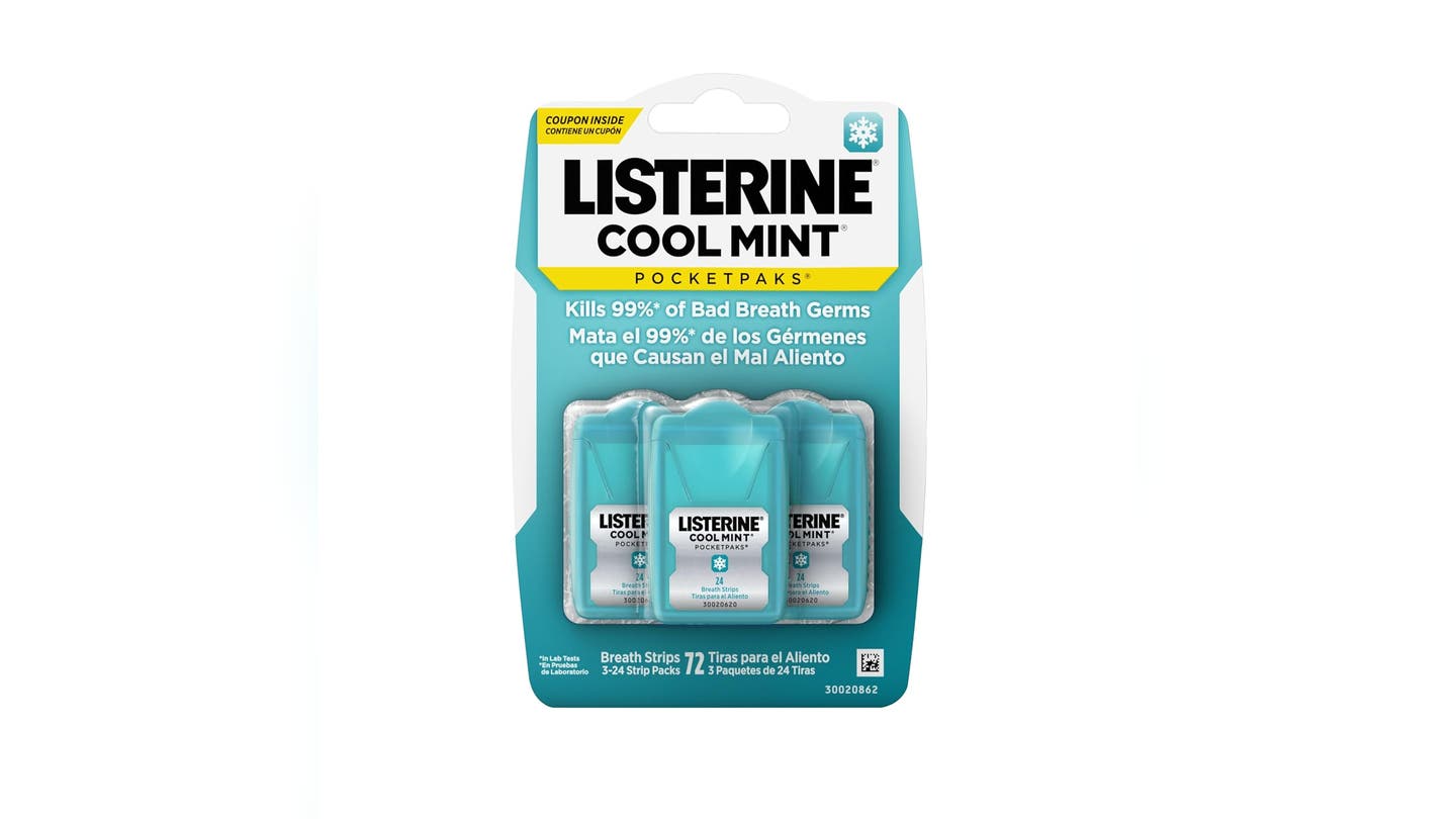 Mantenga un paquete de estos Tiras de aliento de menta fresca listerina En su bolsillo o bolso para la aliento fresco sobre la marcha. Las tiras de aliento matan gérmenes de mal aliento y refrescan tu respiración con un sabor a menta fresco. Las tiras también se disuelven en la boca.